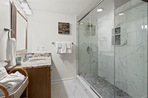 Step into the updated master en suite of our Cotton Bayou condo, featuring modern finishes, dual shower heads for a spa-like experience, and a tranquil atmosphere. The perfect complement to the spacious master suite.